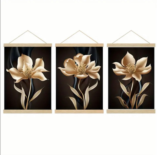 تابلوخام نقاشی با الماس طرح گلهای طلایی3تکه-اورجینالناموجود