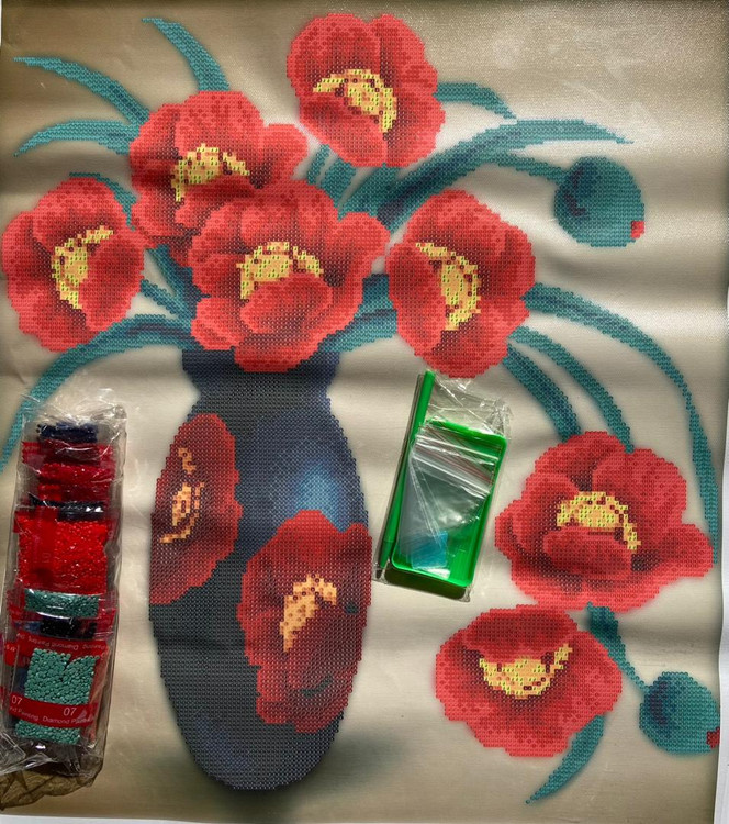 تابلو خام نقاشی باالماس طرح گلدون وگل شقایق-اورجینال