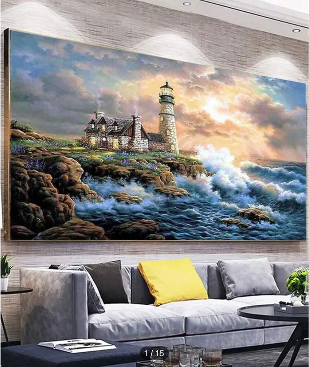 تابلوخام نقاشی با الماس طرح فانوس دریایی واقیانوس-اورجینال