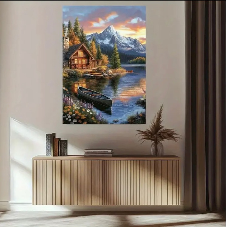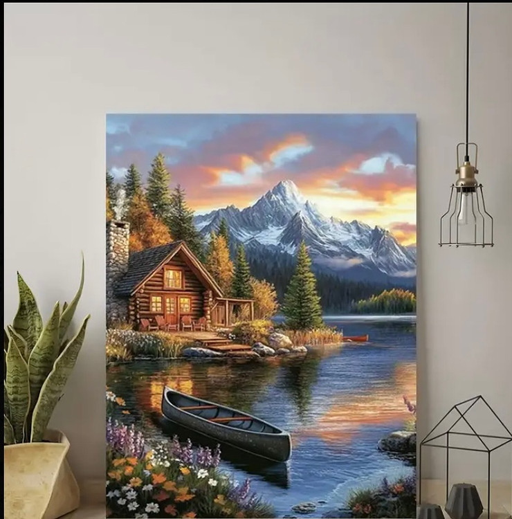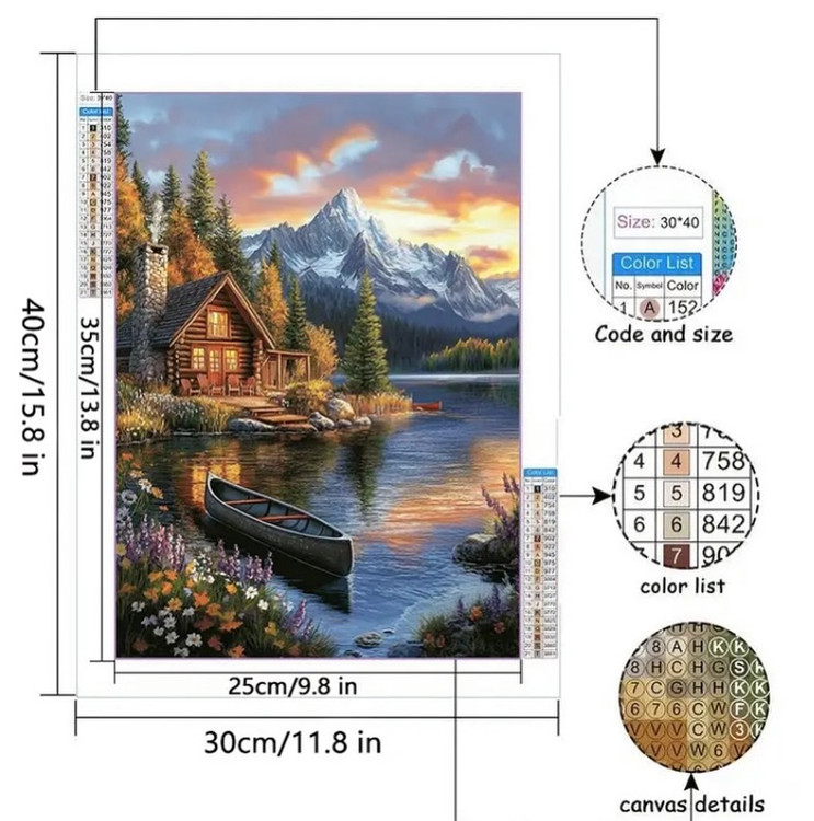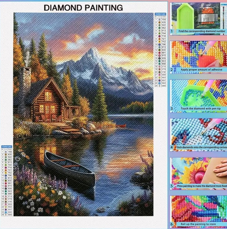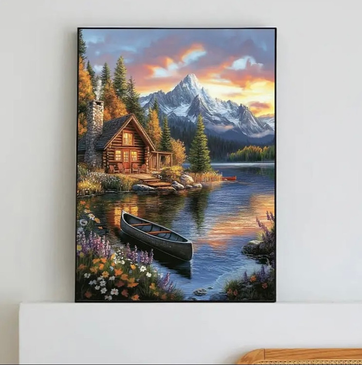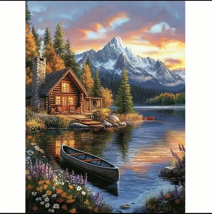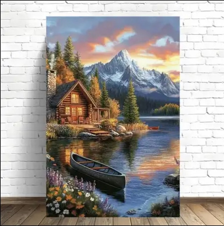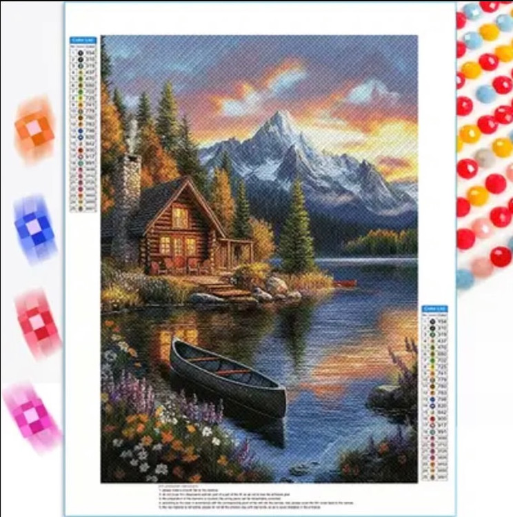 نقاشی باالماس طرح :کلبه کوهستانی کناررودخانه ابعاد:پارچه کنوا 40*30