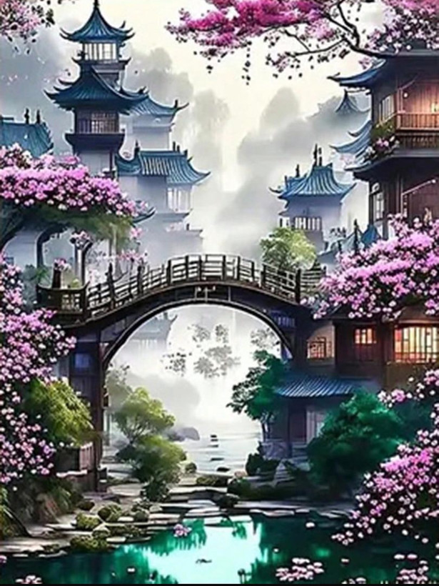 تابلو خام نقاشی باالماس طرح :شکوفه های ساکورا درقصر های ژاپنی-اورجینال