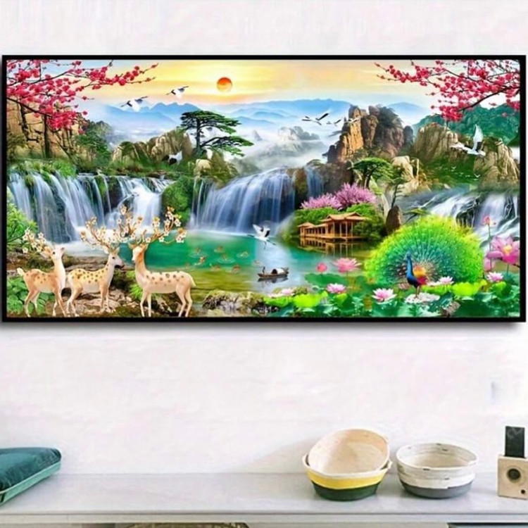 تابلوخام نقاشی باالماس طرح : منظره آبشار وگوزن ها (شان شویی)-اورجینال