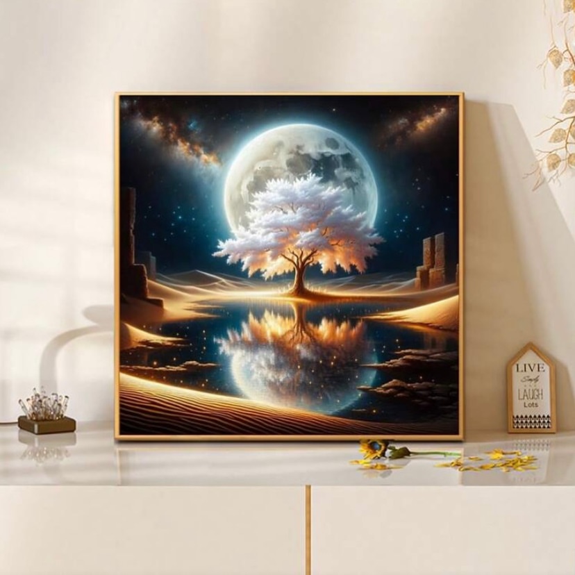 تابلو نقاشی با الماس طرح ماه و درخت سفید با ابعاد 4040. الماس گرد، پک شامل طرح خام و الماسها، سینی، قلم و چسب.
