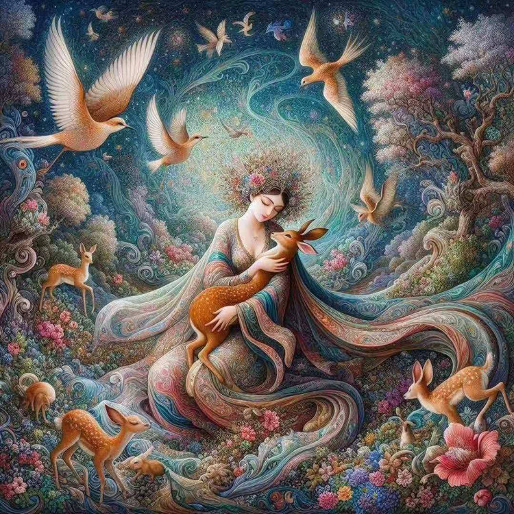 تابلو بومدار نقاشی با الماس طرح زن ایرانی وآهووپرنده-اورجینال