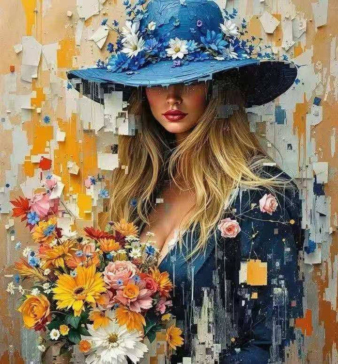 تابلوبومدارنقاشی با الماس طرح دختری با کلاه آبی-اورجینال